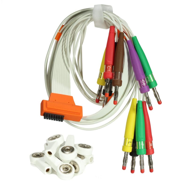 Due to its low power consumption, the touchECG enables continuous monitoring for up to 10 hours. A 13-wire patient cable with snap buttons is included in the delivery.