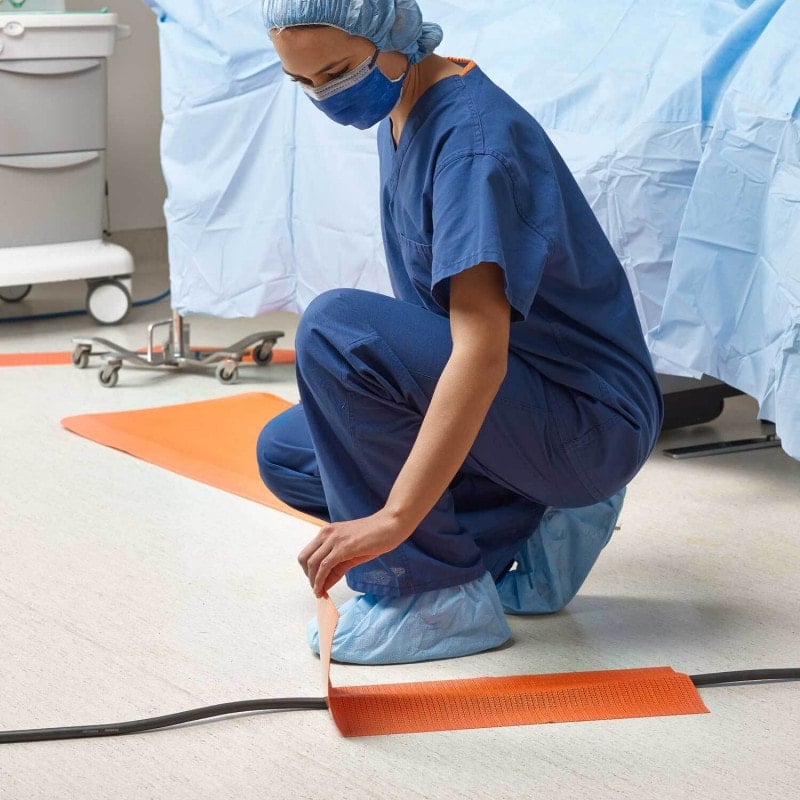 The Trip-No-More cable cover from Sandel is used to secure cables and hoses safely to the floor in the operating theatre. The self-adhesive cover in bright orange is intended to draw the OR staff's attention to the cables laid on the floor, to enable a hazard-free transition and thus to help prevent accidents caused by tripping or falling