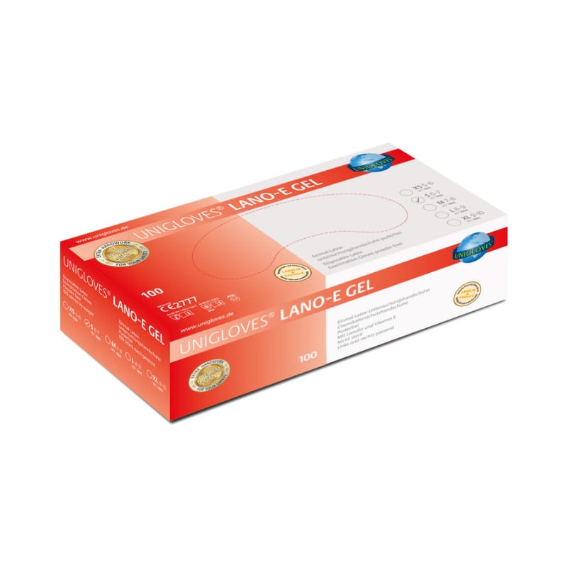 The Unigloves Lano-E Gel exam gloves are available in a wide range of sizes.