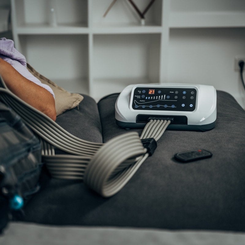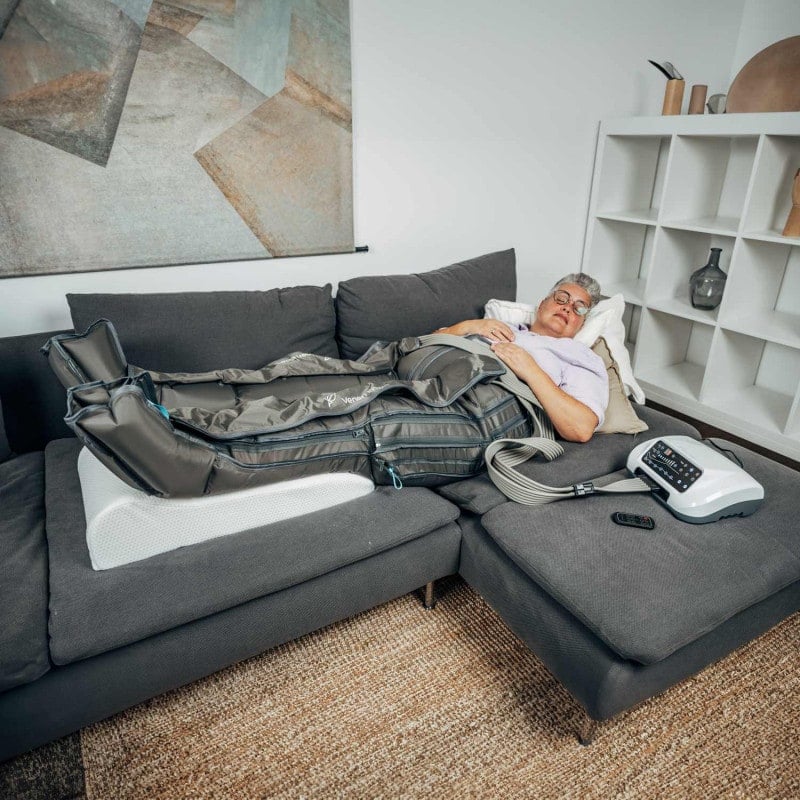 This device covers the feet, legs, abdomen, buttocks and waist, while the multi-zipper allows for flexible adjustment to three different leg circumferences. With six massage programs and customizable time and pressure settings, it offers a tailored therapy experience. Each chamber can be individually deactivated to protect sensitive areas. It is ideal for patients with venous or lymphatic disorders, as it activates lymphatic flow, stimulates circulation, and noticeably relieves heavy legs.