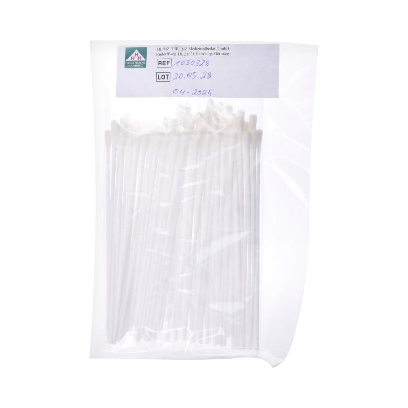 The viscose swab with plastic stick from Heinz Herenz has a length of 150 mm. The viscose swabs are delivered in packs of 100 pieces.