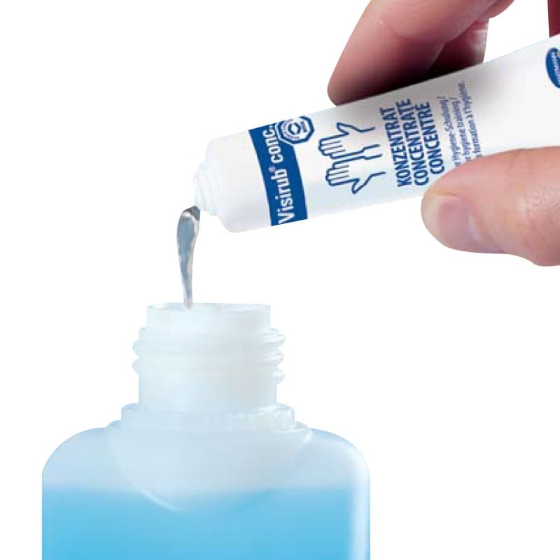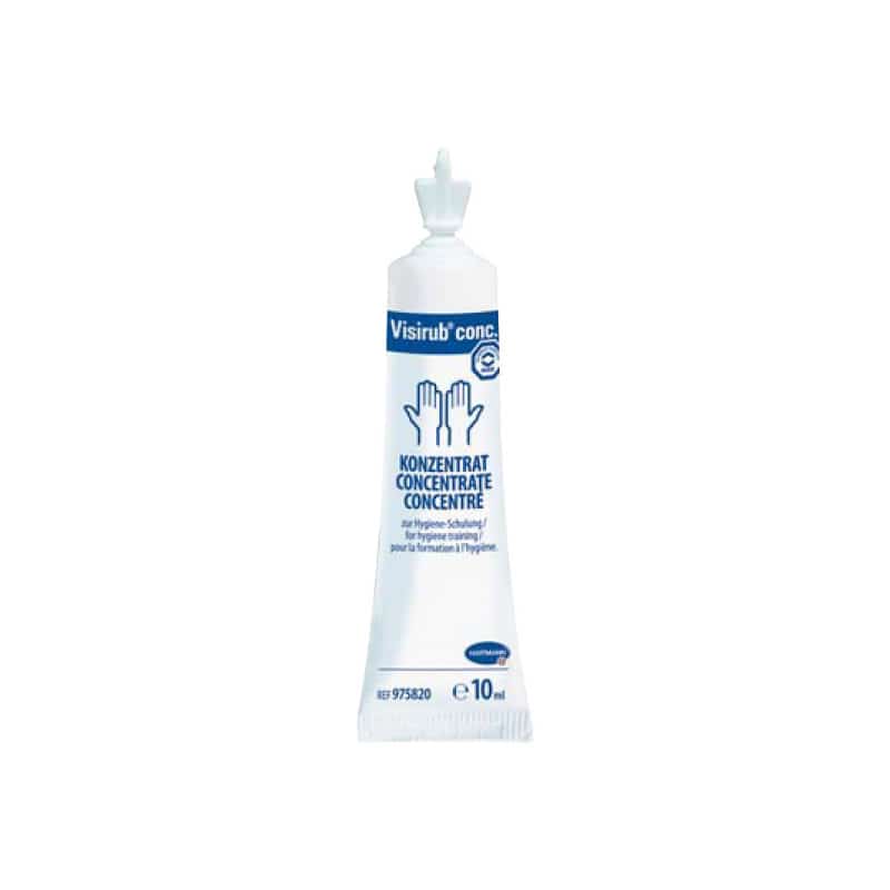 Visirub conc. is a concentration that can be used with Sterillium or Sterillium classic pure to create a fluorescent hand sanitiser. The training solution is used in training courses, to demonstrate gaps in hand disinfection. For this purpose, the participants perform a hand disinfection and subsequently hold their hands under black light. If some spots are not fluorescent, this means that the participant did not use enough disinfectant on them.