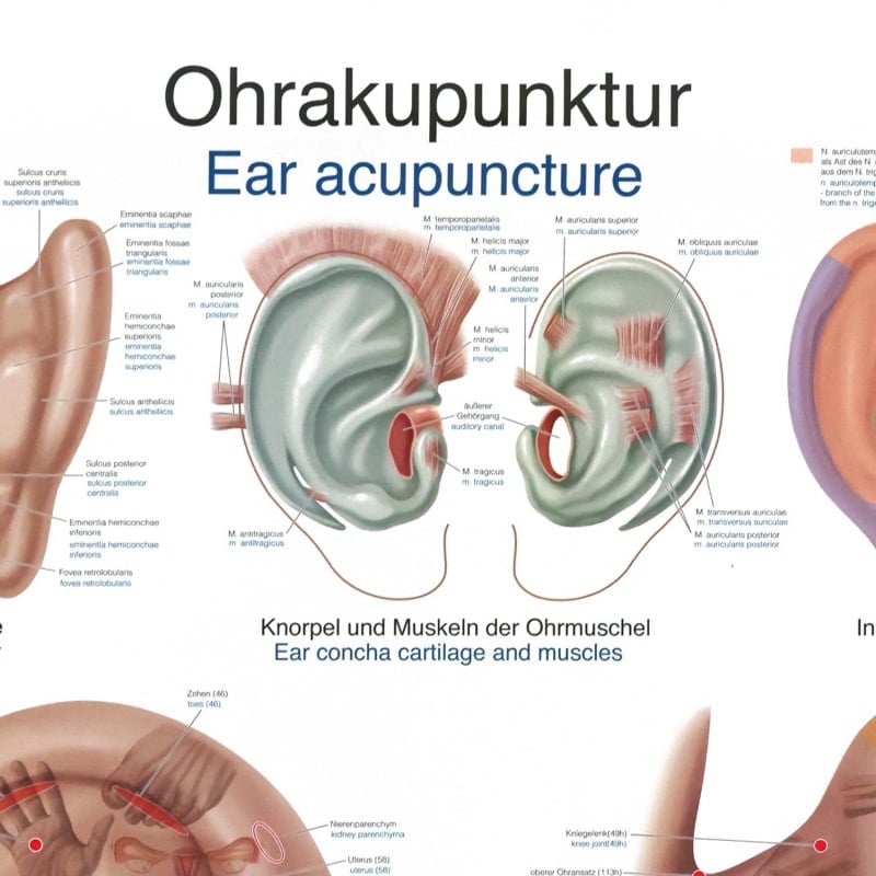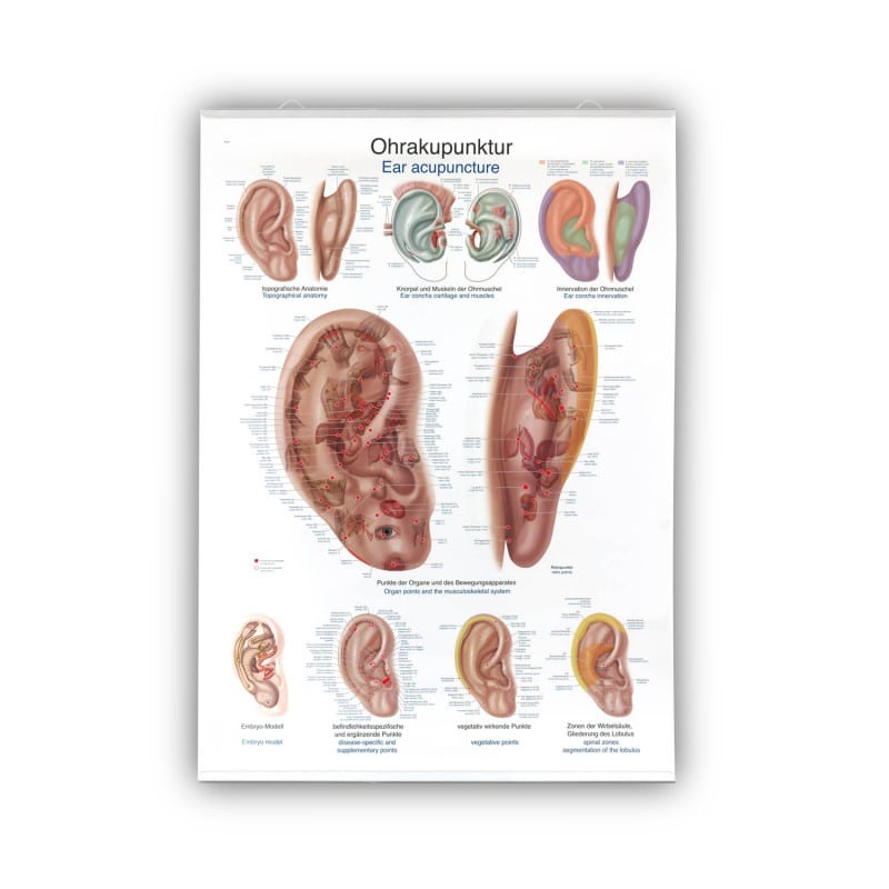 The wall chart "ear acupuncture" from Erler-Zimmer has designations in German and English and is printed on art paper. The teaching board shows the different acupuncture points for ear acupuncture and can be conveniently attached to the wall with the practical hanger.