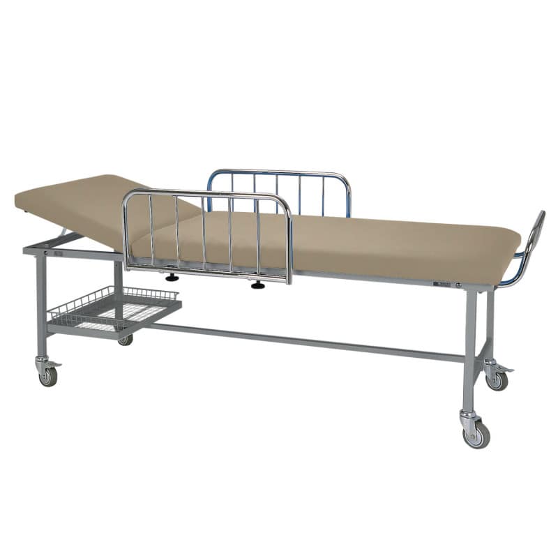 The particularly robust stretcher frame is optionally available in white or grey aluminium and has a maximum load-bearing capacity of up to 250 kg. In addition, a basket mounted under the stretcher allows the patient's personal belongings to be stored. The smooth upholstery cover with velvety shimmer effect is antibacterial, latex-free and available in a variety of colours.