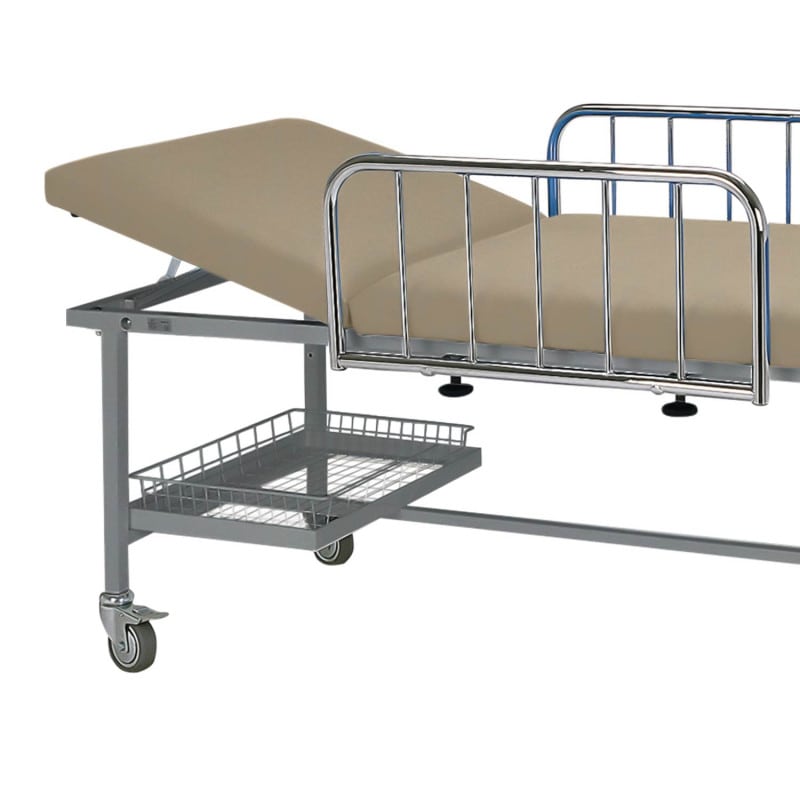The particularly robust stretcher frame is optionally available in white or grey aluminium and has a maximum load-bearing capacity of up to 250 kg. In addition, a basket mounted under the stretcher allows the patient's personal belongings to be stored. The smooth upholstery cover with velvety shimmer effect is antibacterial, latex-free and available in a variety of colours.
