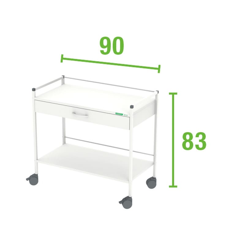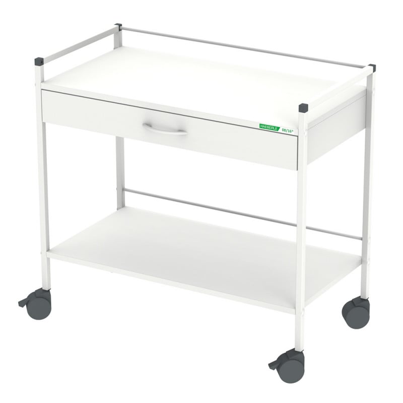 This wide Haeberle multipurpose trolley is equipped with a drawer and two stable, disinfectant-tolerant shelves. The square steel tube frame and both of the stabilising rods make this multipurpose trolley very stable so that it can handle a load of up to 50 kg. The smooth rolling castors allow for mobile use of the Haeberle multipurpose trolley. If necessary, the trolley can even be used stationary via the two brakes.