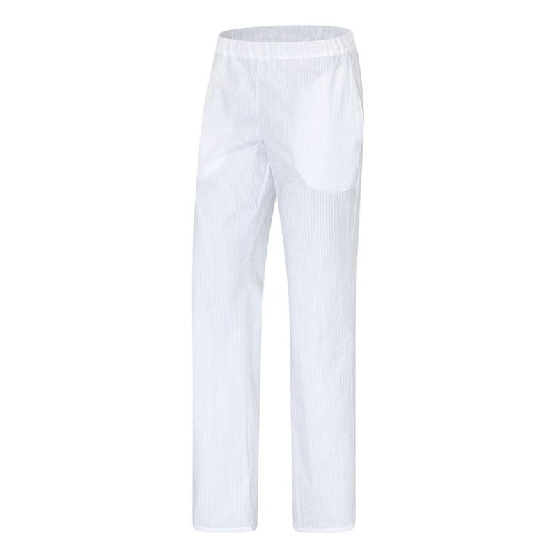 These white seersucker trousers for women with their crinkled texture are not only fashionable but also very easy to care for. They can be washed at up to 60 °C and have an elasticated waistband and two side pockets. Thanks to the casual style and wide cut and the practical slip-on shape, they are particularly comfortable to wear, for example, during care work.