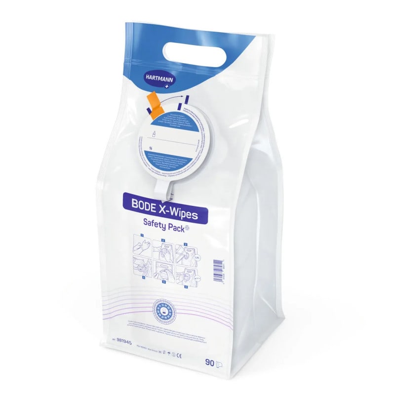The BODE X-Wipes dispenser system has an integrated fleece roll and can be combined with all liquid HARTMANN surface disinfectants. Since reprocessing is not required, the disposable dispenser system is suitable for all healthcare areas with an increased risk of infection, such as isolation wards, oncology or burn wards. The sealed system has a patented opening for filling with 2.5 litres of disinfection solution. The combination of shaped dispensing system, rigid bag material and moulded bottom ensures that the system stands upright until the last wipe has been dispensed..