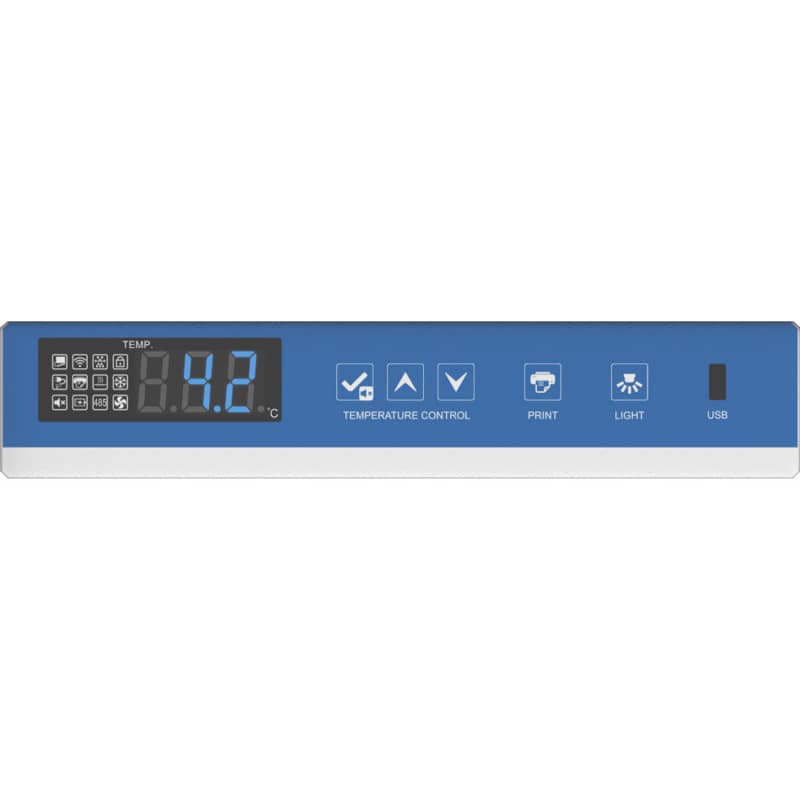- Audible alarm for temperature deviations, power outage or door opening