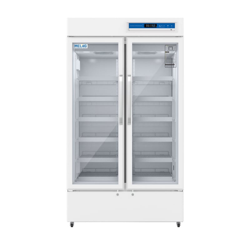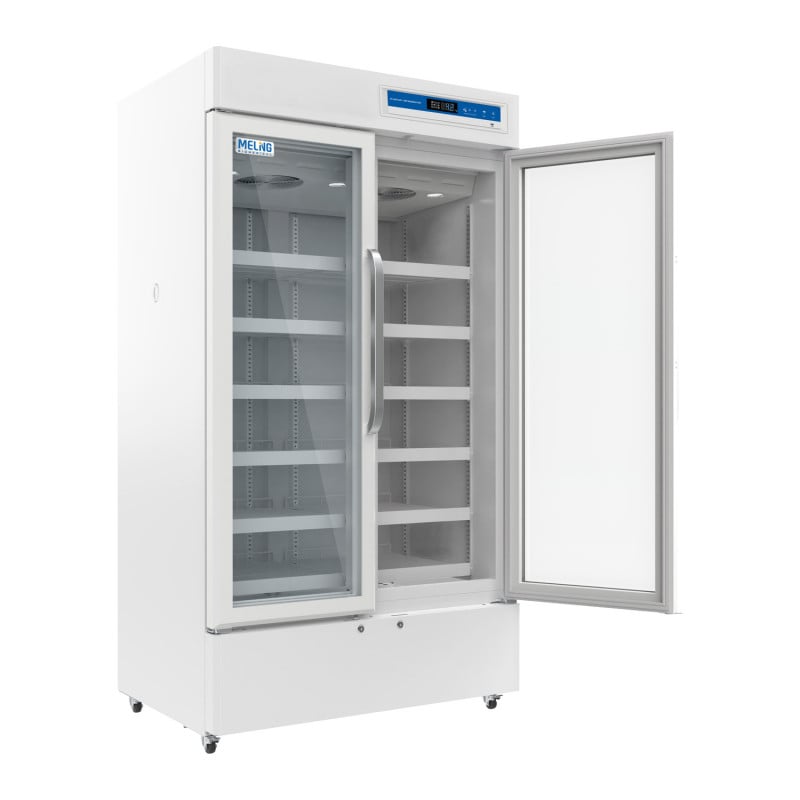 The YC-725L Pharmacy Refrigerator from Meling offers precise temperature control thanks to its high-precision microcomputer temperature control system and a bright digital display with an accuracy of 0.1 °C. In addition, it is equipped with a remote alarm access port and a 485 data access port. Its refrigeration system consists of a high-quality compressor, a high-effeciency air-cooling condenser and a finned evaporator for fast refrigeration. The refrigerator also has easy-to-clean shelves made of PVC-coated steel wire, sturdy door handles and a practical test port for temperature testing inside the cabinet. Interior lighting also provides a clear view of the interiror.