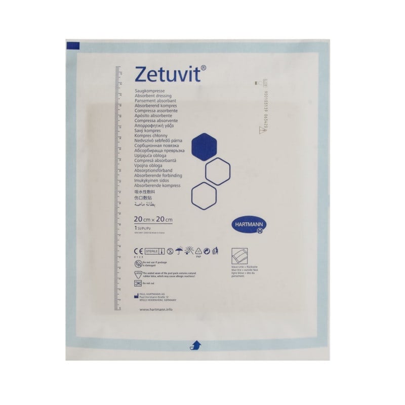 Zetuvit sterile absorbent compresses from Hartmann have an outer covering of a two-ply non-woven fabric. The covering prevents the dressing from sticking to the wound and the inner side of the non-woven fabric quickly passes the exudate into the absorbent core, due to its high capillary activity. Zetuvit absorbent compresses are used for treating heavily exuding wounds or for padding wounds, for example.